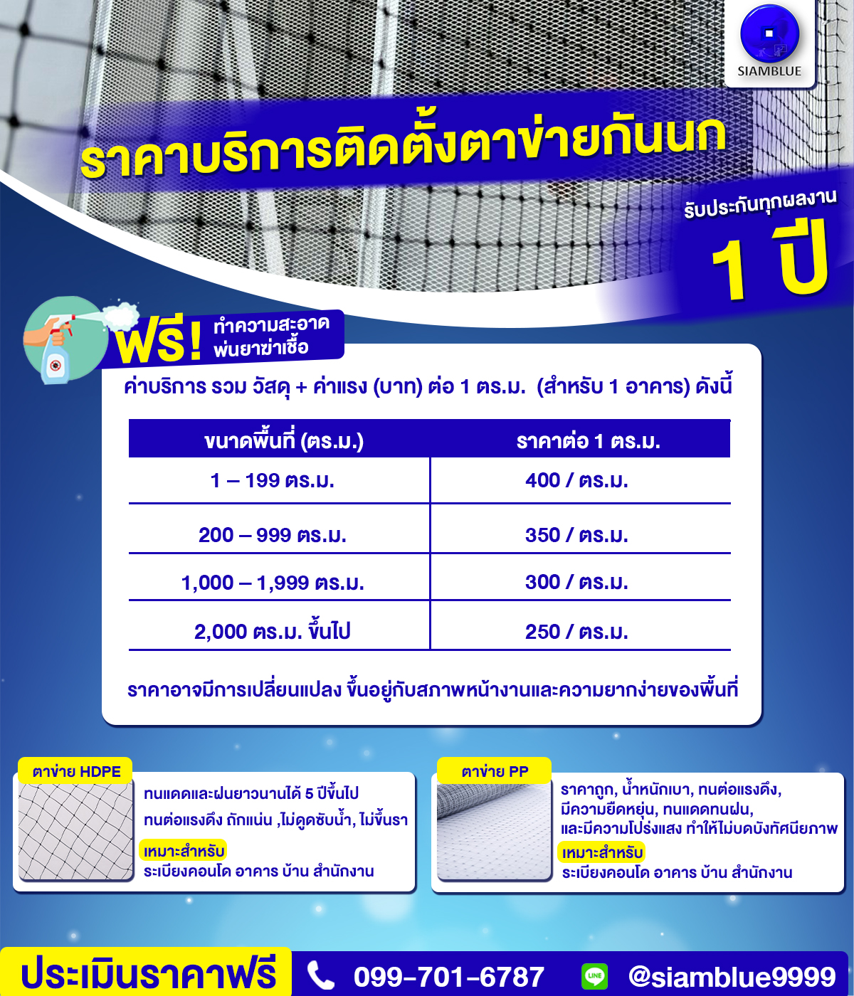 ใช้ป้องกันนกพิราบ นกกระจอก มารบกวนใจ ใช้สำหรับ บ้าน คอนโด โรงแรม รีสอร์ท โรงงาน และสถานที่อื่นๆ อีกมากมาย ตามที่ลูกค้าเห็นว่าสมควร เราให้บริการติดตั้งตาข่ายกันนก โดยมีช่างผู้ชำนาญงาน และรับผิดชอบต่องานเป็นอย่างดี เนื้อตาข่ายที่เราใช้เป็นวัสดุที่มีคุณภาพได้มาตรฐานจากโรงงานผู้ผลิต